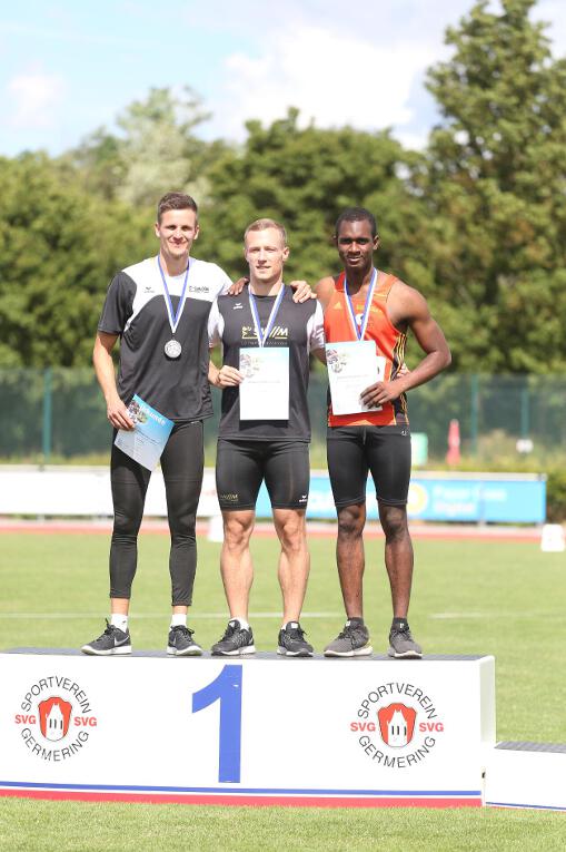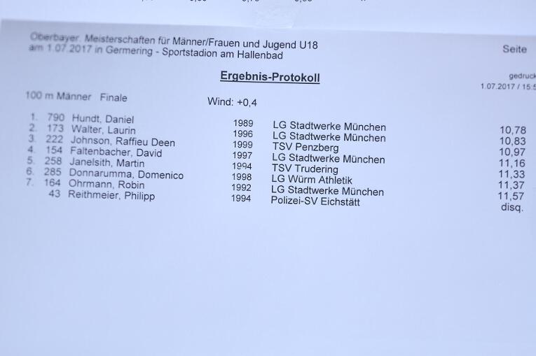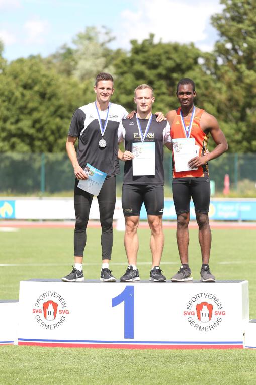 Jetzt steht die 10 vor dem Komma! Raffieu hat endlich sein persönliches Ziel für diese Saison erreicht, eine Zeit von unter 11 Sekunden. Im 100m-Finale der Männer lief der 17-jährige Penzberger 10,97 Sekunden bei regulärem Rückenwind von +0,4m/s. Damit wurde er Dritter hinter Sieger Daniel Hundt (10,79 Sek.) und Laurin Walter (10,83 Sek. - beide LG Stadtwerke München). Nachdem er im Vorlauf bereits mit 11,08 Sekunden eine neue Bestzeit aufgestellt hatte, verschlief er zunächst den Start im Finale, doch glücklicherweise musste der Start aufgrund eines Fehlstarts wiederholt werden. Im zweiten Anlauf kam Raffieu optimal aus den Startblöcken und konnte lange Zeit mit Hundt und Walter mithalten. Erst auf den letzten 30 Metern musste er seine älteren Konkurrenten ziehen lassen.