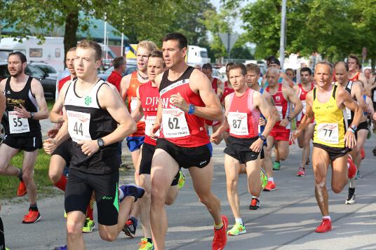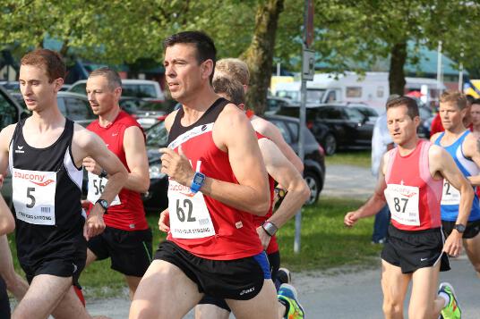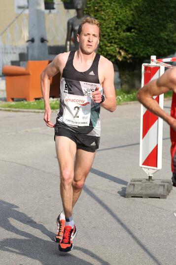 RUHSTORF / 28.05.2016 - Markus hat bei den bayerischen 10km-Meisterschaften in Ruhstorf Bronze bei den Männern, Silber im Team und Gold in seiner Altersklasse (M35) gewonnen. In einem perfekt eingeteilten Rennen musste er sich mit 32:53 Minuten nur den beiden Favoriten, Tobias Schreindl (LG Passau / 31:41 Min.) und Tobias Gröbl (LG Zusam / 32:27 Min), geschlagen geben. Gleich nach dem Start suchte er sich eine Position in einer Gruppe hinter den beiden Erstplatzierten. Dort konnte sich Markus bei schwül-heißen 27°C etwas verstecken. Zwischen der Gruppe und den beiden Führenden lief zunächst der Passauer Florian Stelzle, der genauso wie Markus der Altersklasse M35 angehört. „Obwohl Stelzle bereits ca. 60 Meter Vorsprung hatte, war ich mir ziemlich sicher, dass wir ihn noch einholen würden“, so Markus. Mit „wir“ meint er Daniel Götz (SV Bergdorf-Höhn) und Florian Wenzler (LG Würm Athletik), die sich bereits nach zwei von fünf Runden vom Rest des Feldes absetzen konnten. Nach 6,5 Kilometern war es dann so weit, die Drei hatten Stelzle eingeholt. Als dann Markus und Florian Wenzler an dem Passauer vorbeiliefen, musste Götz abreißen lassen, sodass sich nun ein Zweikampf zwischen den beiden Läufern um die Bronzemedaille entwickelte. „Eingangs der letzten Runde habe ich dann gemerkt, dass Florian an Boden auf mich verlor. Deshalb habe ich dann etwas beschleunigt“, so Markus zu seiner Renntaktik. Auf dem letzten Kilometer beschleunigte der 36-Jährige dann noch einmal deutlich und lief diesen in 3:10 Minuten. So konnte er noch 16 Sekunden Vorsprung auf Wenzler herauslaufen. Mit seiner Zeit kam Markus bis auf 5 Sekunden an seine Bestzeit heran, was in Ruhstorf ansonsten so gut wie keinem Athleten gelang. Dies lag nicht nur daran, dass man pro 2km-Runde ca. 9 Höhenmeter überwinden musste, sondern vor allem an der hohen Luftfeuchte und den hohen Temperaturen. So mussten zahlreiche Athleten nach dem Zieleinlauf medizinisch versorgt werden, blieben natürlich deutlich über ihrer Bestzeit oder mussten sogar aufgeben.