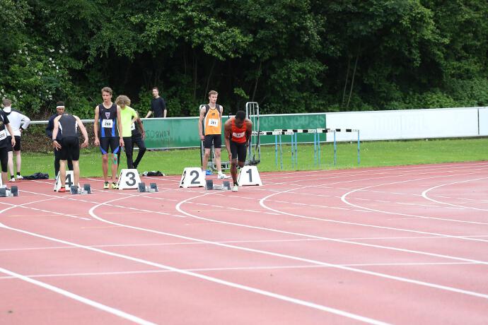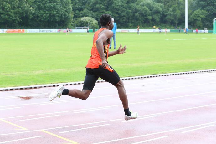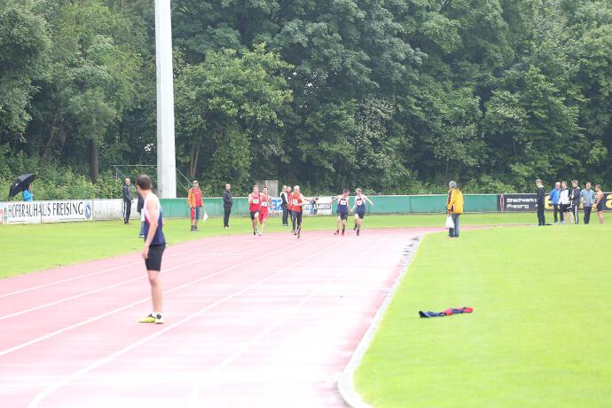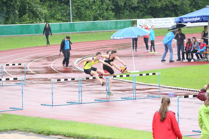 Andi mit Hürden-Double nicht ganz zufriedenÜber 110m Hürden hat Andi mit 15,82 Sekunden die Goldmedaille bei den Männern gewonnen. Leider war außer Andi kein anderer Mann am Start, sodass er im selben Lauf mit der Altersklasse U18 starten musste. Mit seiner Zeit war er nicht unzufrieden, obwohl er 0,30 Sekunden über seiner Bestleistung blieb. Schließlich regnete es bei seinem Lauf ziemlich stark. Bei seinem Lauf über 400m Hürden regnete es zumindest nicht, trotzdem kam er nicht an die Zeiten aus der Vorwoche heran, was sicherlich daran lag, dass einerseits die Konkurrenz fehlte und er andererseits die Vorbelastung der 110m Hürden und der 4 x 100m-Staffel in den Beinen hatte. Hier durfte er aber nur knapp 40 Meter laufen. Die 4 x 100m-Staffel der Männer erreichte nämlich leider nicht das Ziel, da Andi die Sicht auf die Wechselmarkierung versperrt wurde und deshalb zu früh startete. Aus diesem Grund bremste Andi dann stark ab, aber leider traf Matthias beim ersten Versuch nicht die Hand von Andi, sodass beide die Wechselzone überliefen und das Rennen abbrachen. So konnten Maxi und Dominik leider nicht mehr ins Rennen eingreifen.