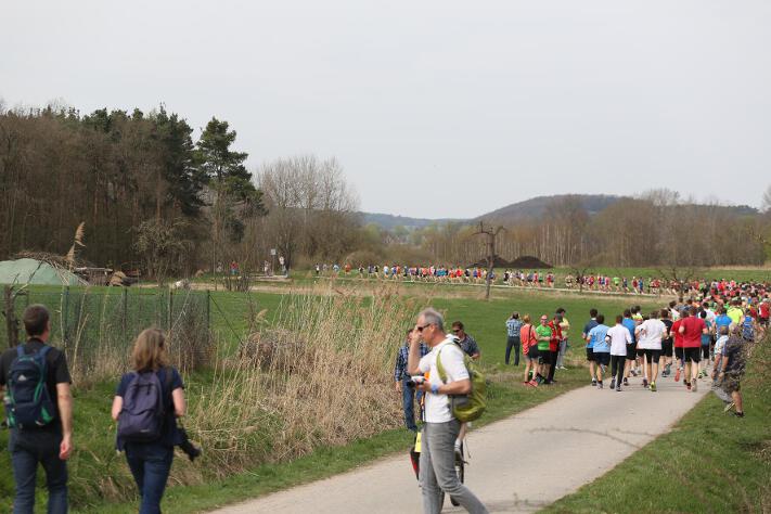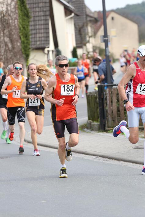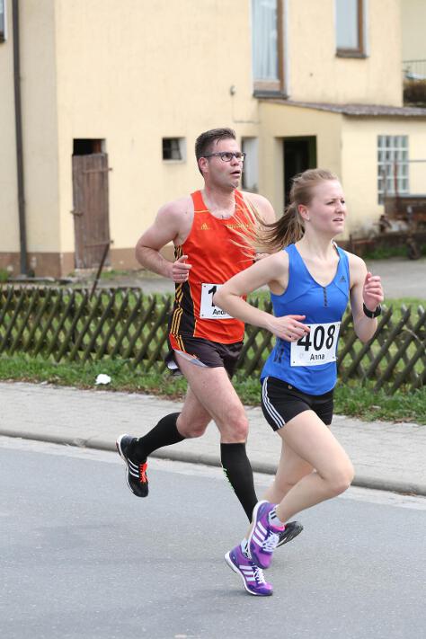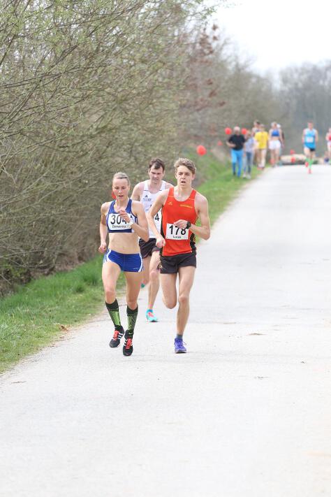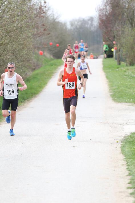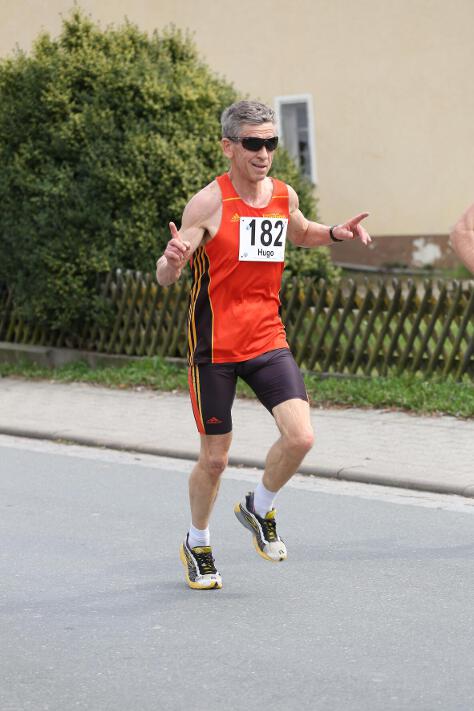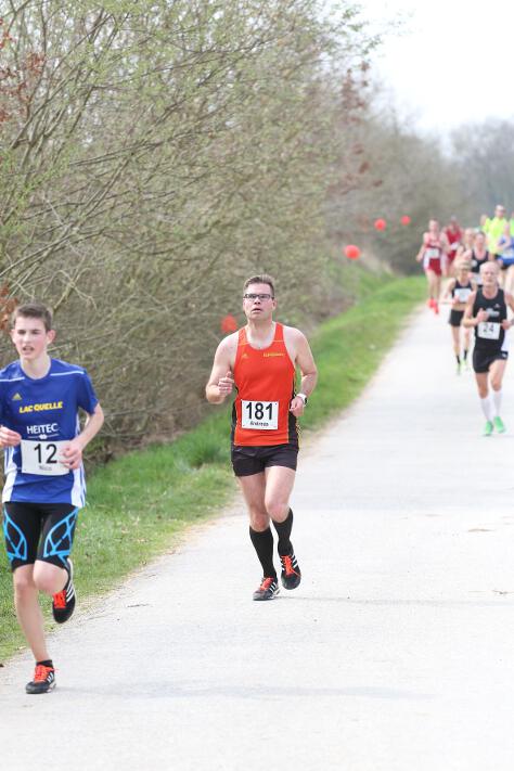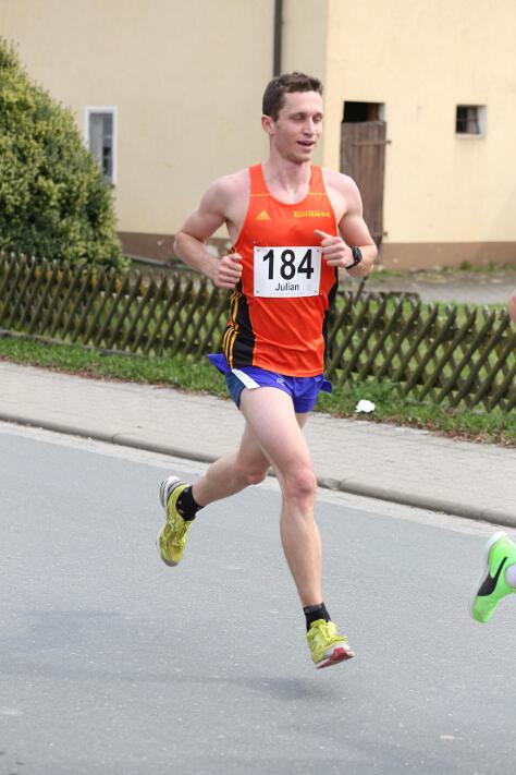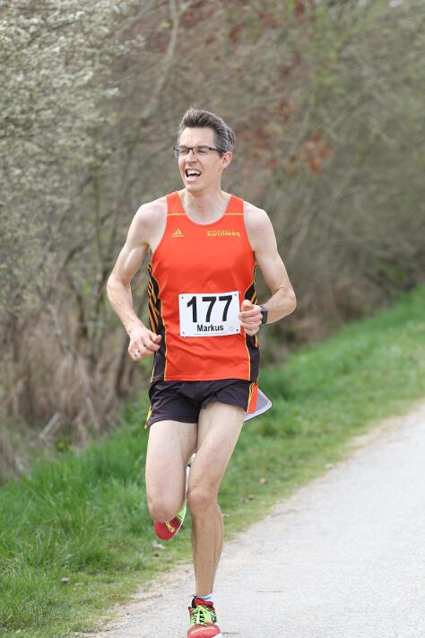 Bei fast schon sommerlichen Temperaturen von 25°C liefen Markus und Nick zunächst gemeinsam in einer siebenköpfigen Läufergruppe hinter dem Spitzenfeld, das aus den drei späteren Siegern bestand, unter anderem auch dem bayerischen Meister Martin Grau (TSV Höchstadt / Aisch), der sich mit 30:55 Minuten souverän durchsetzen konnte. „Die Gruppe war optimal, da der außer Konkurrenz startende Sebastian Reinwand das Tempo für einen Vereinskollegen mit einer Zielzeit von exakt 32:00 Minuten machte“, so Markus, der die 5km-Marke nach 15:57 Minuten passierte. Auch Nick versuchte zunächst den Anschluss zu halten. „Ich habe sofort gemerkt, dass das Tempo für mich einen Tick zu hoch ist, aber ich wollte nicht alleine gegen den Wind laufen“, so der 17-jährige Penzberger, der in Adelsdorf seinen ersten richtigen 10km-Wettkampf überhaupt bestritt. Am Ende der ersten Runde, nach knapp 4 Kilometern, musste der Gymnasiast abreißen lassen und lief von nun an alleine. Währenddessen setzte sich aus der Gruppe um Markus Johannes Hillebrand (LG Stadtwerke München) nach vorne ab. Da der Münchner ebenfalls wie Markus der Altersklasse M35 angehört, versuchte er Hillebrand zu folgen. „Im Nachhinein war das eine schlechte Entscheidung, da ich so zwei Kilometer alleine im Wind laufen musste und dabei viel Kraft verloren habe.“ So kam es, dass die anderen Läufer um Daniel Götz und Sebastian Reinwand zwei Kilometer vor dem Ziel wieder aufschließen konnten und der Penzberger auf dem letzten Kilometer, der zum Ziel noch einmal 20 Höhenmeter nach oben führte, knapp 25 Sekunden auf seine Konkurrenten verlor. Trotzdem blieb er eine Sekunden unter seiner Bestzeit. Natürlich ebenfalls Bestzeit erzielte Nick, der mit 33:15 Minuten mehr als überzeugen konnte, denn mit seinen 17 Jahren war er mit Abstand der jüngste Läufer im Vorderfeld.