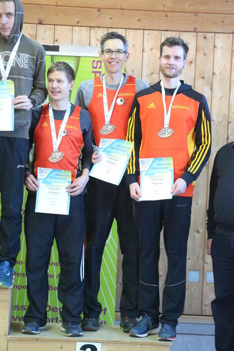 Im letzten Rennen des Tages, dem Langstreckenrennen der Männer über 8km, wurden die Penzberger Starter mit einer Bronzemedaille in der Teamwertung belohnt. Bester Penzberger war dabei Christian, der mit 27:44 Minuten den 5.Platz belegte. Der 27-jährige Coburger startete zunächst etwas verhalten in das Rennen, konnte sich dann aber immer weiter nach vorne arbeiten. Dabei war er am Ende über die gute Einzelplatzierung überrascht: „Ich hätte nicht gedacht, dass ich mit so wenig Laufkilometern in der Vorbereitung so weit vorne landen würde.“ Gleiches gilt für Markus, der mit 28:50 Minuten Zehnter wurde. „Ich bin erst wieder seit sieben Wochen im Training, dafür lief es ganz gut“, so der 38-jährige TSV-Läufer. Das Trio komplettierte Paul, der aus der vollen Marathon-Vorbereitung heraus Rang 15 belegte. „Die ersten drei Runden hat es sich echt locker angefühlt, doch ab der vierten Runden ging nichts mehr“, so das Fazit des 26-jährigen Masters-Studenten aus Pöcking, der die erste Rennhälfte gemeinsam mit Brennauer gelaufen war. Seine Unzufriedenheit wich dann aber schnell der Freude über seine erste Medaille bei bayerischen Meisterschaften überhaupt, als feststand, dass die drei Penzberger hinter dem Team Memmert und der LG Passau Dritter geworden waren.