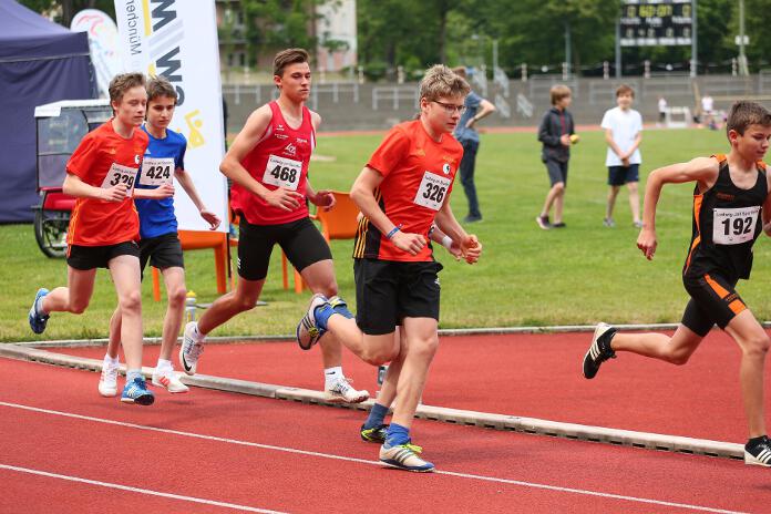 Eine neue Bestleistung erzielte auch Colin, der in der M15 mit 2:14,10 Minuten Dritter wurde. In einem klug eingeteilten Rennen konnte der 14-jährige Penzberger vor allem auf den letzten 200 Metern seine Klasse zeigen. Zu diesem Zeitpunkt lag er noch 30 Meter hinter den beiden Führenden. Doch mit seinem energischen Zwischenspurt gelang es ihm, die Lücke eingangs der Zielgerade auf nur noch drei Meter zu verkleinern. Auf den abschließenden 100 Metern änderte sich an dieser Konstellation nichts mehr. Mit 2:14,10 Minuten verpasste er die B-Norm für die bayerische Leichtathletikmeisterschaft im Übrigen nur um 0,10 Sekunden. Dass er in München mit den Spikes von Sharon lief, da ihm seine eigenen nicht mehr passen, hatte ihn also in keinster Weise gestört. Im selben Rennen lieferten sich zudem Sven und Julian ein spanndes Duell. Auf der Zielgerade liefen beide Schulter an Schulter, wobei sich Julian mit 2:26,27 Minuten mit 0,09 Sekunden vor Sven durchsetzen konnte.