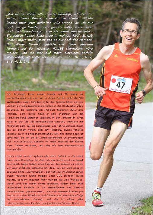 Dieses etwas andere Tagebuch gibt einen Einblick in das Leben eines Laufenthusiasten, bei dem sich das Laufen nicht nur darauf beschränkt, tagein tagaus einen Fuß vor den anderen zu setzen. Der Leser erlebt das komplette Jahr 2017 aus der Sicht eines im positiven Sinne „Laufverrückten“, der nicht nur im Oktober seinen ersten Marathon (wenn möglich unter 2:25 Stunden) laufen möchte, sondern mitunter mehr trainiert als viele Weltklasse-Läufer, und dies neben einem Vollzeitjob. Zudem erhält man ungeschönte Einblicke in die Gedankenwelt des überaus nachdenklichen „Vereinsmeiers“, der sich mehrere Stunden pro Woche um seine Athletinnen und Athleten des TSV Penzberg und viele andere Dinge des Vereinslebens kümmert, und der in nahezu jeder Lebenssituation eine Parallele zu seiner liebsten Sportart findet.